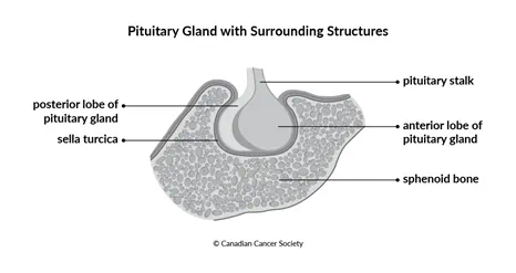 The pituitary gland is divided into 2 parts (lobes). The front part closer to the face is called the anterior pituitary gland. The back part is called the posterior pituitary gland, and it is closer to the back of the head. The pituitary gland is surrounded by bone (sphenoid bone), and it sits in a pouch called the sella turcica.