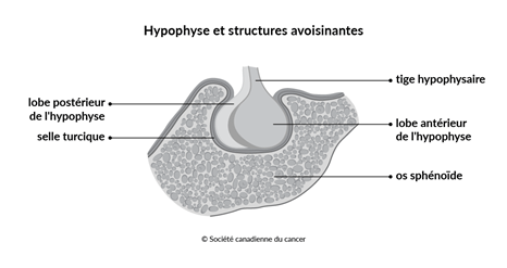 L’hypophyse est divisée en deux parties appelées lobes. La partie avant la plus près du visage se nomme adénohypophyse. La partie qui est derrière est appelée neurohypophyse, et elle est située plus près de l’arrière de la tête. L’hypophyse est entourée d’un os, soit l’os sphénoïde, et elle repose dans une poche appelée selle turcique.